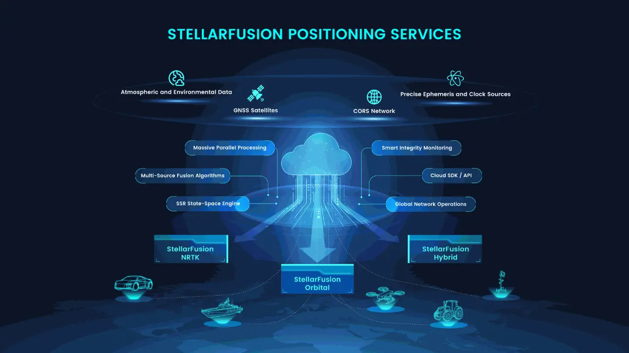 StellarFusion is a global high-precision positioning service platform built on next-generation state-space augmentation technology. Centered on multi-source GNSS data fusion algorithms and a cloud-based real-time state-space correction generation engine, the platform dynamically delivers network-based positioning services, satellite-based positioning services, and smart fusion positioning services.