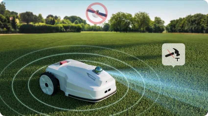 Offers 360° LiDAR sensing and physical bumpers to keep mowing safe.
